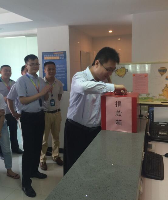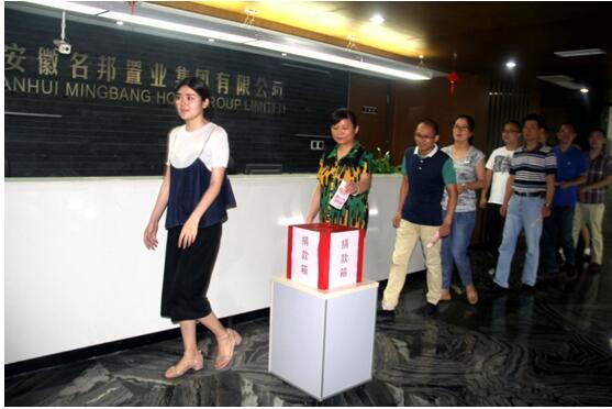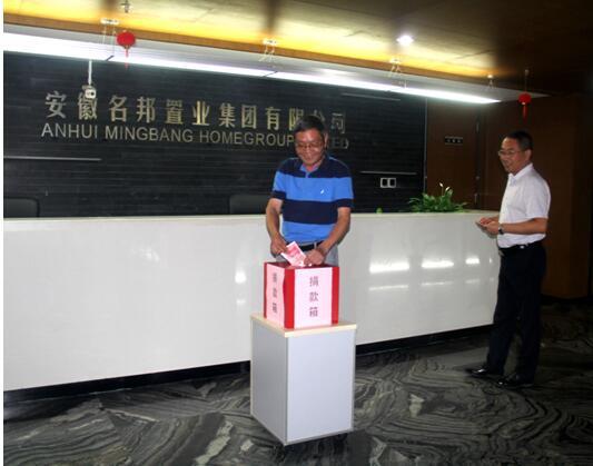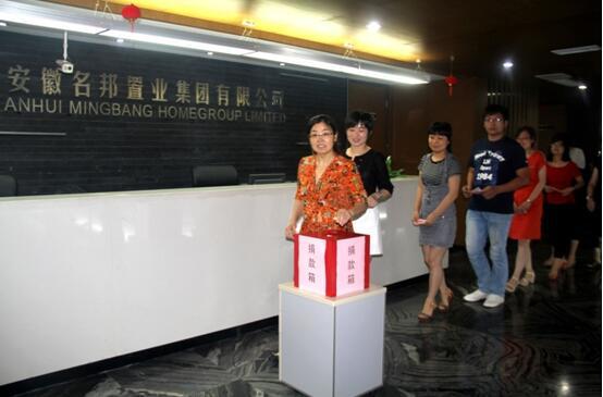 2016年7月26日上午10點(diǎn),名邦地產(chǎn)集團(tuán)“支援肥西災(zāi)區(qū)人民,名邦同仁共獻(xiàn)愛心”募捐活動(dòng)在集團(tuán)公司正式舉行。名邦地產(chǎn)集團(tuán)總經(jīng)理彭玉剛、常務(wù)副總經(jīng)理李寬洲、副總經(jīng)理張貴、王彧翰、劉兵等領(lǐng)導(dǎo)帶頭捐款,其他各部門同事也踴躍參與,共獻(xiàn)愛心,共同為肥西人民重建家園出一份力。