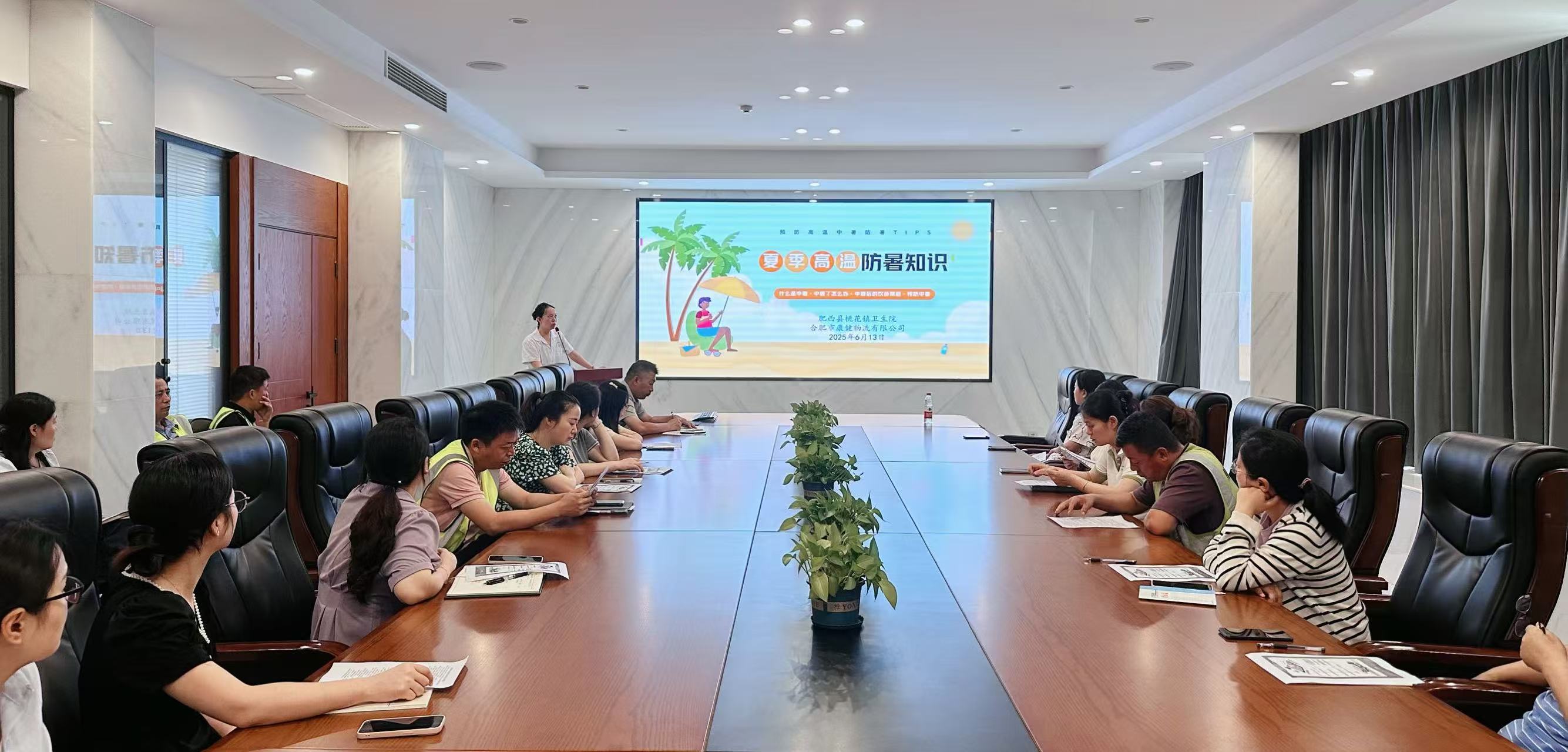 盛夏時節,高溫天氣即將來襲,尤其是園區作業戶外勞動者面臨較高的職業性中暑風險。為切實保障勞動者的健康權益,普及防暑降溫知識,2025年6月13日上午,由康健物流公司主辦,肥西縣桃花鎮衛生院協辦的“關愛員工,科學預防中暑”主題科普講座在公司三樓會議室如期開展,約30名一線員工代表參加講座。