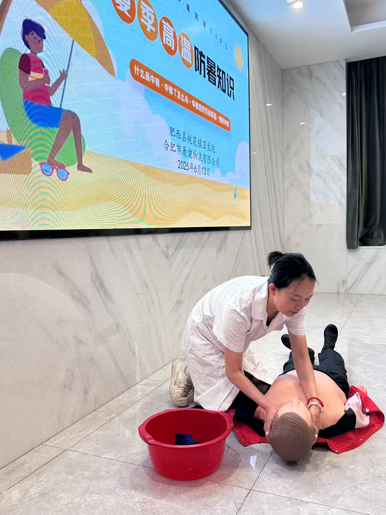 講座現場,肥西縣桃花鎮衛生院健康專家程醫生圍繞中暑防治知識展開專題講座,詳細講解中暑癥狀、分級及緊急處理措施、科普高溫作業防護要點,并重點分享了中暑與熱射病的關鍵區別與預防,幫助一線員工提高自我保護意識。現場設置了“中暑急救模擬操作”環節,程醫生演示直觀生動,倉儲部員工上臺進行了實踐練習,進一步強化了中暑應急的處置能力。