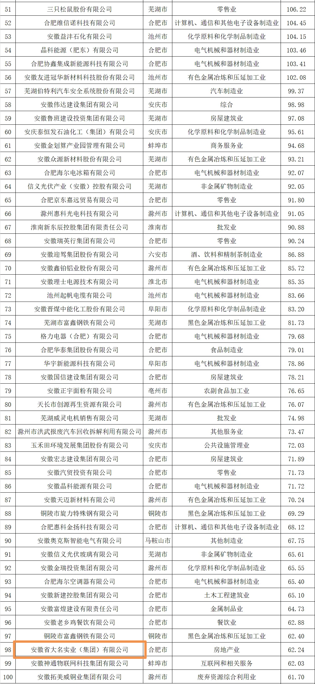 10月16日上午,2025安徽省民營企業百強發布會在合肥舉辦。會上,發布了2025安徽省民營企業營收百強榜單、2025安徽省民營企業制造業百強榜單、2025安徽省民營企業服務業百強榜單、2025安徽省民營企業吸納就業百強名單及《2025安徽省民營企業百強分析報告》。 安徽省大名實業(集團)有限公司榮獲2025安徽省民營企業營收百強榜!榮獲2025安徽省民營企業服務業23強稱號,相比去年排名提升7位!