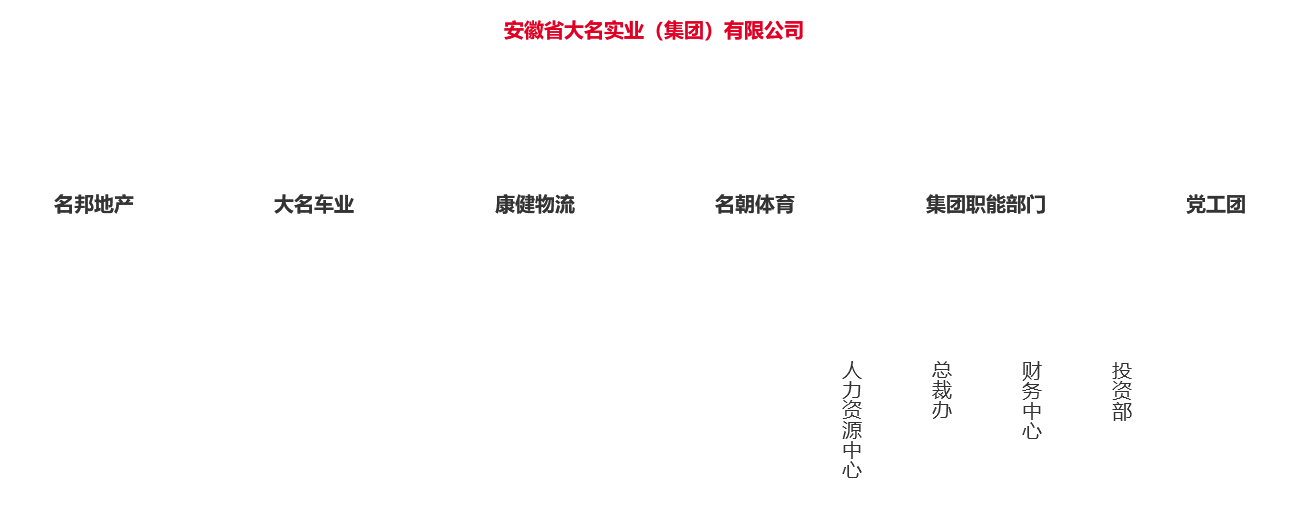 安徽省大名實業(集團)有限公司,其前身是經安徽省體改委批準設立的全省100家股份制試點企業之一,是集品牌代理、連鎖服務、房產投資開發、資本運營及多元化發展為一體的民營股份制投資管理型企業。集團目前主要有四大產業:大名車業主要經營代理品牌汽車及新能源車;名邦地產以房地產開發為業務發展主線,覆蓋營銷代理、物業管理、商業運營、商住智能化及景觀綠化施工等產業;物流集貨物運輸、倉儲、配送、流通加工、包裝為一體,依托完善的運輸網絡優勢,力求提高客戶供應鏈系統效率;名朝體育匯集了優秀的教練員、運動員、裁判員以及教務團隊、銷售團隊,目前有七家校區和一家籃球公園,未來將有更多的校區陸續開放中。